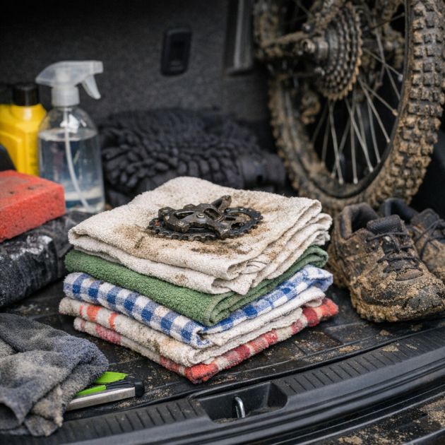 Keep your old dish towels in your car for quick clean-ups or to use as drying cloths after washing your vehicle. They are also handy for wiping down your bike after a muddy ride or cleaning your shoes.