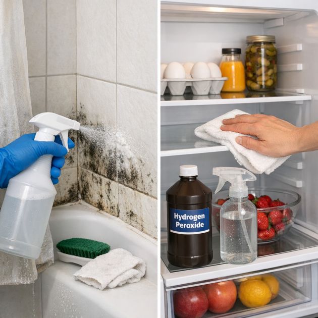 Mold and mildew can be persistent problems in damp areas of the home. To address these, spray undiluted hydrogen peroxide onto the affected areas and let it sit for 10-15 minutes before wiping clean. This method is effective for bathroom tiles, shower curtains, and other damp surfaces.