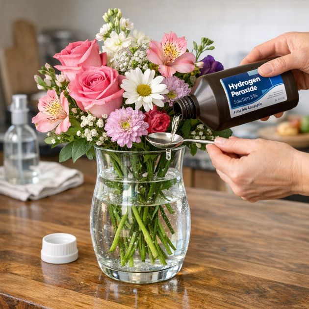 To keep cut flowers fresh longer, add a teaspoon of hydrogen peroxide to a quart of water in the vase. This solution helps to kill bacteria that can shorten the lifespan of flowers. Change the water every few days, adding fresh hydrogen peroxide each time, to ensure your flowers stay vibrant and healthy.