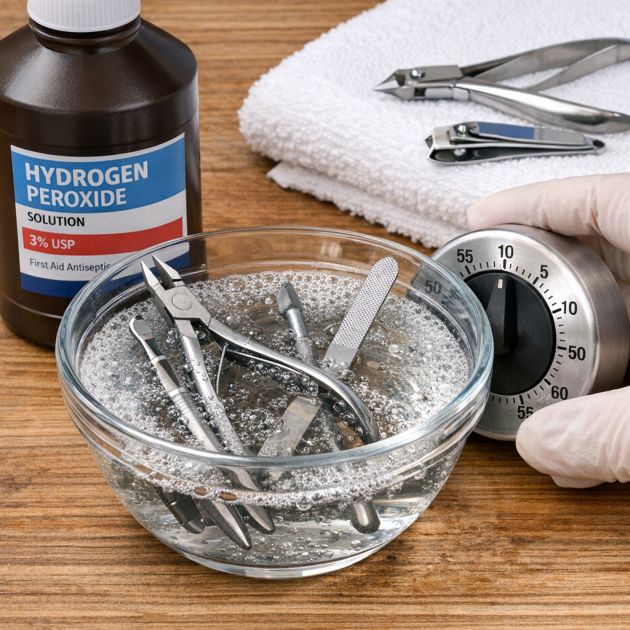 For nail tools, soak them in hydrogen peroxide for 10 minutes to disinfect. This practice is especially important to prevent fungal infections and maintain hygiene.