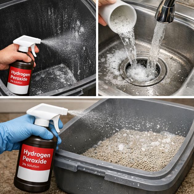 For drains, pour a cup of hydrogen peroxide down the drain and let it fizz for a few minutes. Follow with hot water to clear out any remaining residue. Litter boxes can be sprayed with hydrogen peroxide after scooping to help control odors and disinfect the surface.